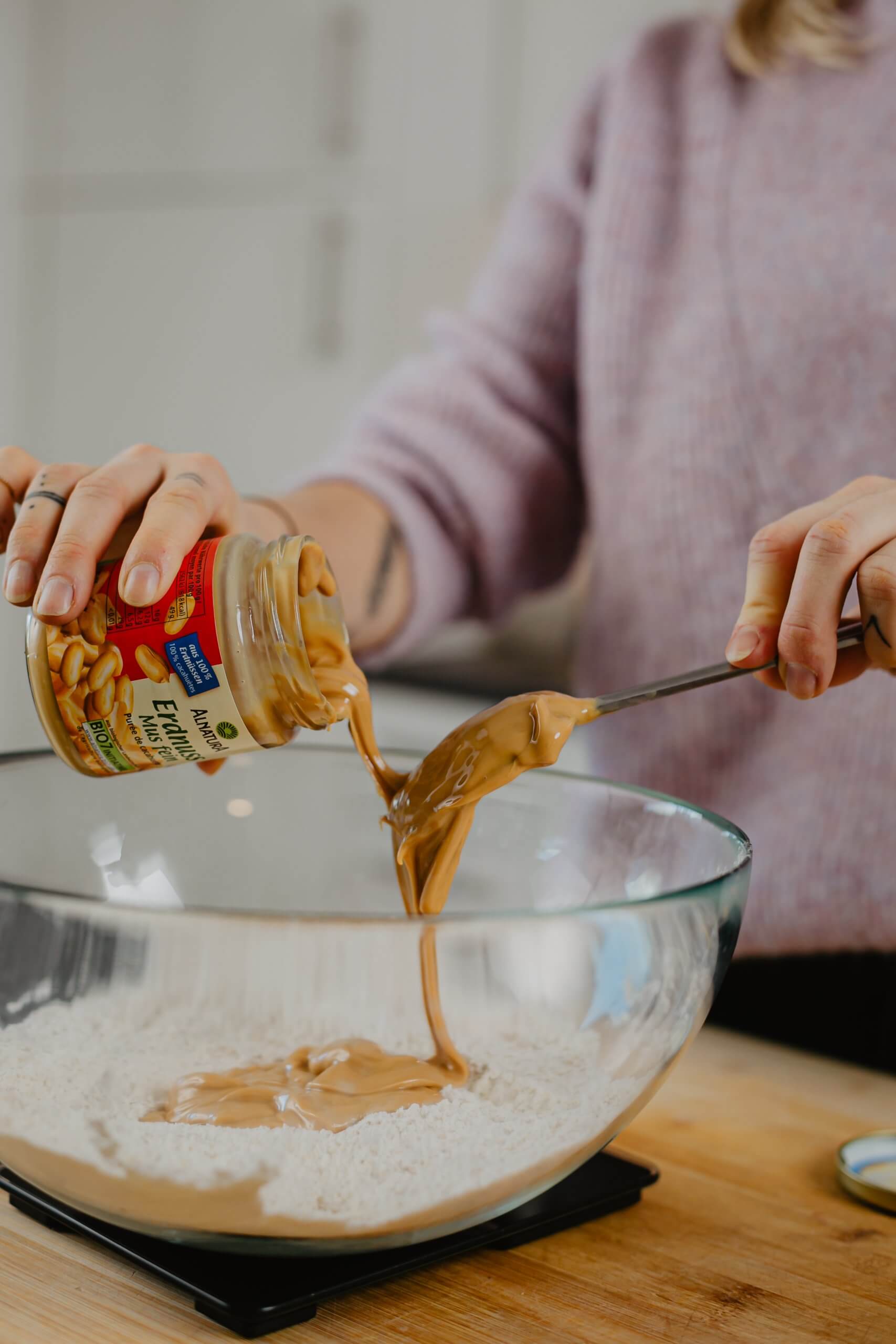 - Erdnussbutter, Milch und Kokosöl untermischen und alles gut durchmixen.