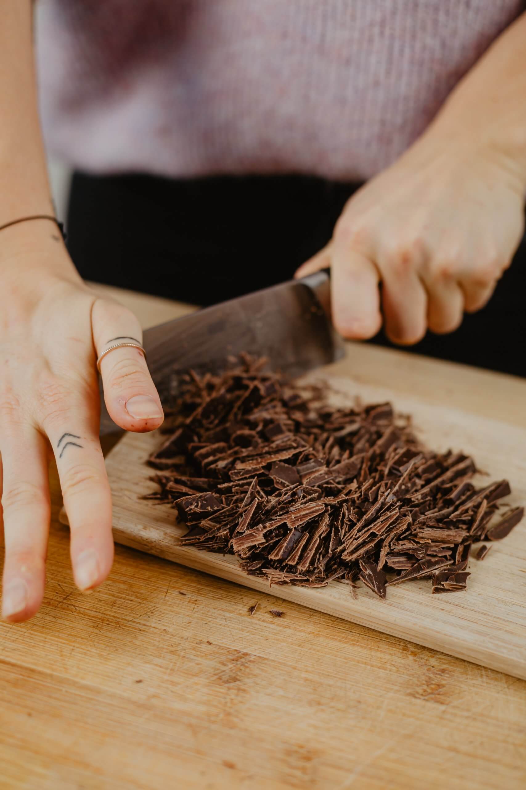 - Schokolade klein hacken und zur Masse geben.