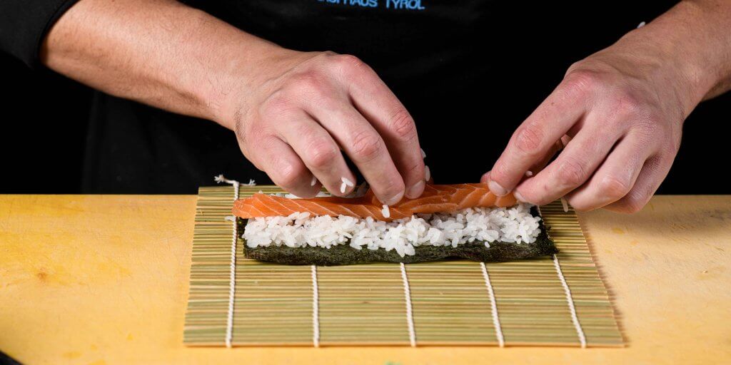 Ca. 50 g Fisch mittig auf den Reis platzieren, dann die Maki-Rolle mithilfe der Bambusmatte in Form drücken.