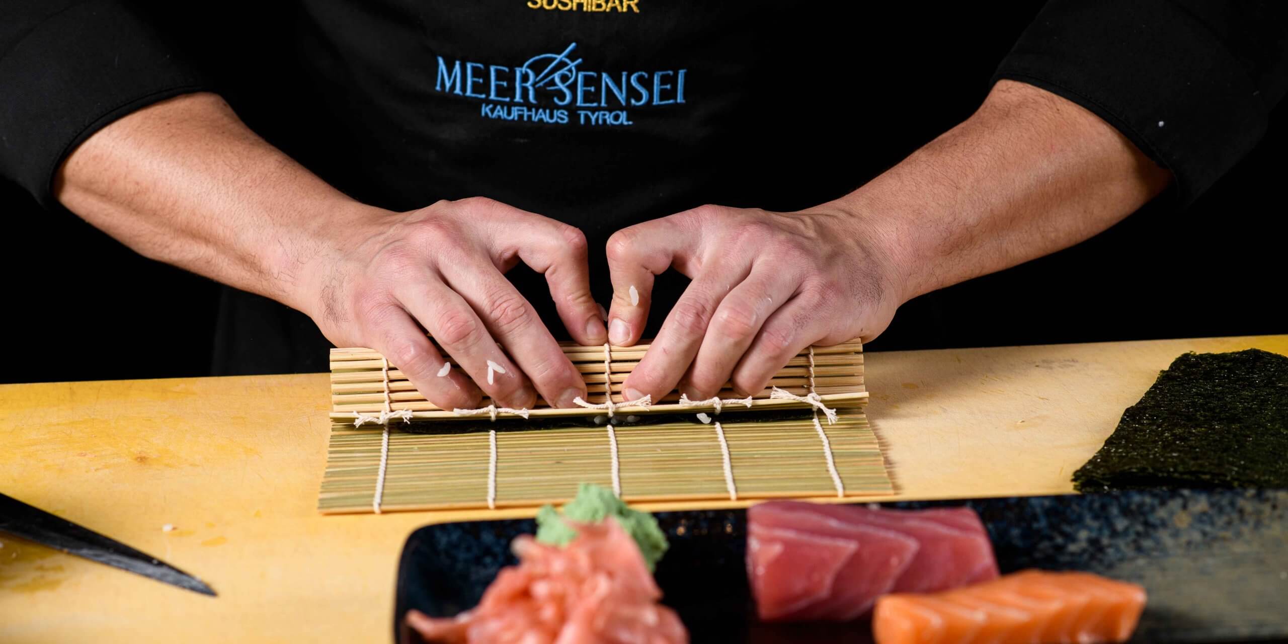 Rodney Pereira Andrade vom MEER SENSEI im Kaufhaus Tyrol verrät, wie man zu Hause perfekte Teka (Thunfisch) und Sake (Lachs) Maki zubereitet.
